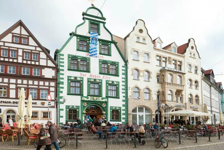 Als eines der ältesten Gasthäuser Europas hat das „Gasthaus Zur Hohen Lilie“ eine jahrhundertelange Geschichte vorzuweisen und ist ein fester Bestandteil des Erfurter Stadtbildes. Die erste Erwähnung erfolgte im Jahre 1341, doch wie viele andere historische Gebäude fiel das Haus 1472 dem großen Erfurter Stadtbrand zum Opfer. 1478 wurde das Gebäude dann wiedererrichtet und galt als „bedeutendster Gasthof der Stadt“. Neben zahlreichen Besuchen durch historische Persönlichkeiten wie Martin Luther, Kurfürst August von Sachsen und viele mehr, kehrte auch Bundeskanzler Dr. Helmut Kohl 1990 nach einer Rede auf dem Domplatz hier ein. Nach Einstellen des Gaststättenbetriebs im Jahre 1991 begannen im Jahre 2000 die Sanierungs- und Umbauarbeiten. Seit 2002 ist das denkmalgeschützte „Gasthaus Zur Hohen Lilie“ wiederöffnet. 2017 zieht in das historische Gebäude bayerische Tradition und Münchner Bierkultur ein. Das „Hofbräu am Dom“ ist als Lizenznehmer Markenbotschafter von Hofbräu München in Thüringen und verbindet damit Thüringer Gastfreundschaft mit Münchner Wirtshauskultur.